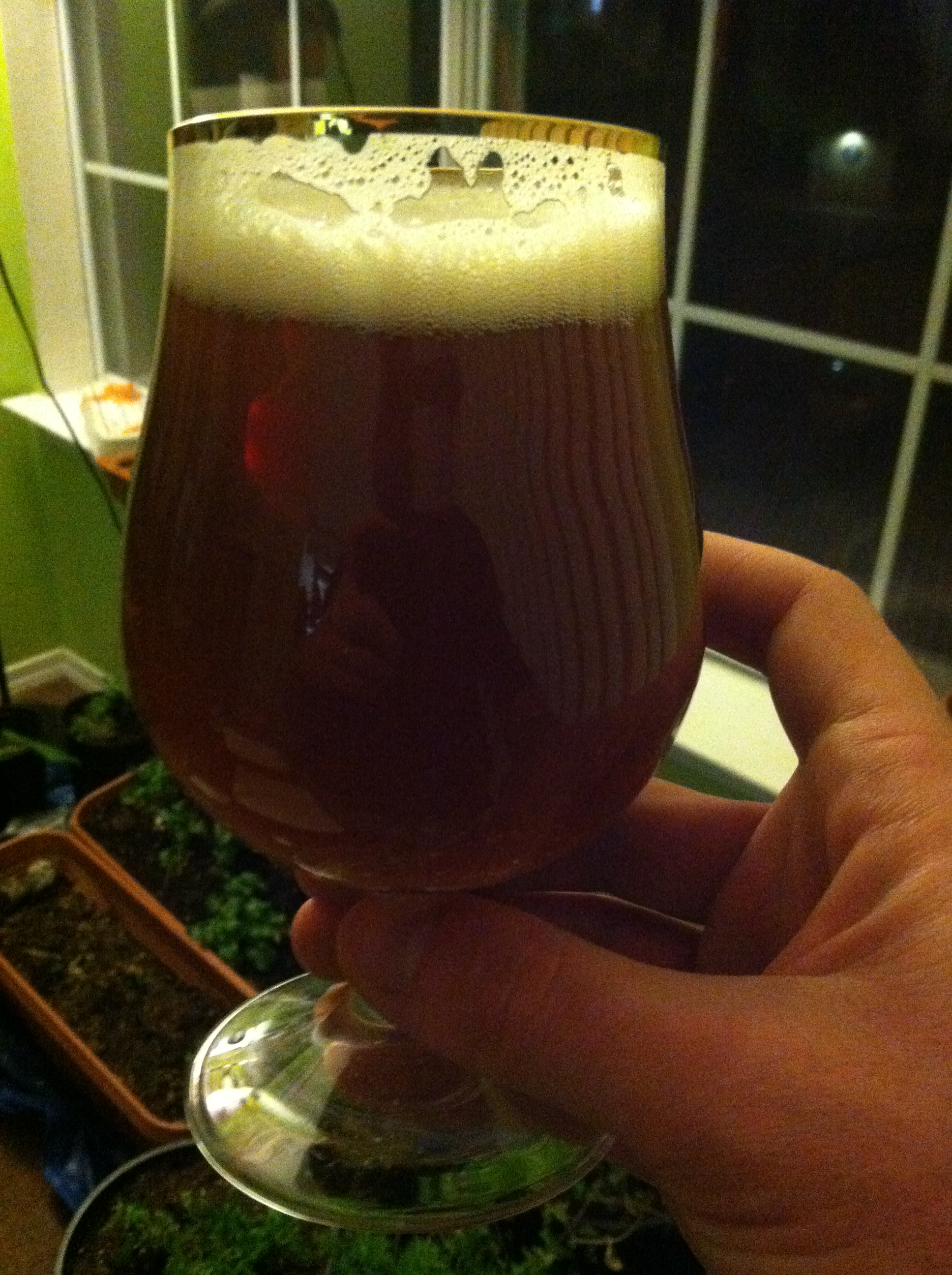 As you can see in the picture, the color of this barleywine came out much darked than expected, amber with a foamy, white head. My guess is that an extended boil to condense the wort from 5 to 3 gallons really pushed this blonde-ish beer from a predicted 6 SRM into the 10s. In smelling, mainly a fruity amoma with some malt, likely from the British Ale yeast being pushed to its alcohol tolerance. Amoma carries through well in the flavor, dark fruits with some sweet malt. Also some earthiness is appearence likely from the EKG hops; bitterness comes across as balanced. No oxidation is appearant (yet!). After tasting, I would summarize my overall impression as if you crossed a traditional English barleywine and Belgian triple, which is to be expected as both recipes share many similiarities. This one will be exciting to taste in future years. Try this recipe for something different!