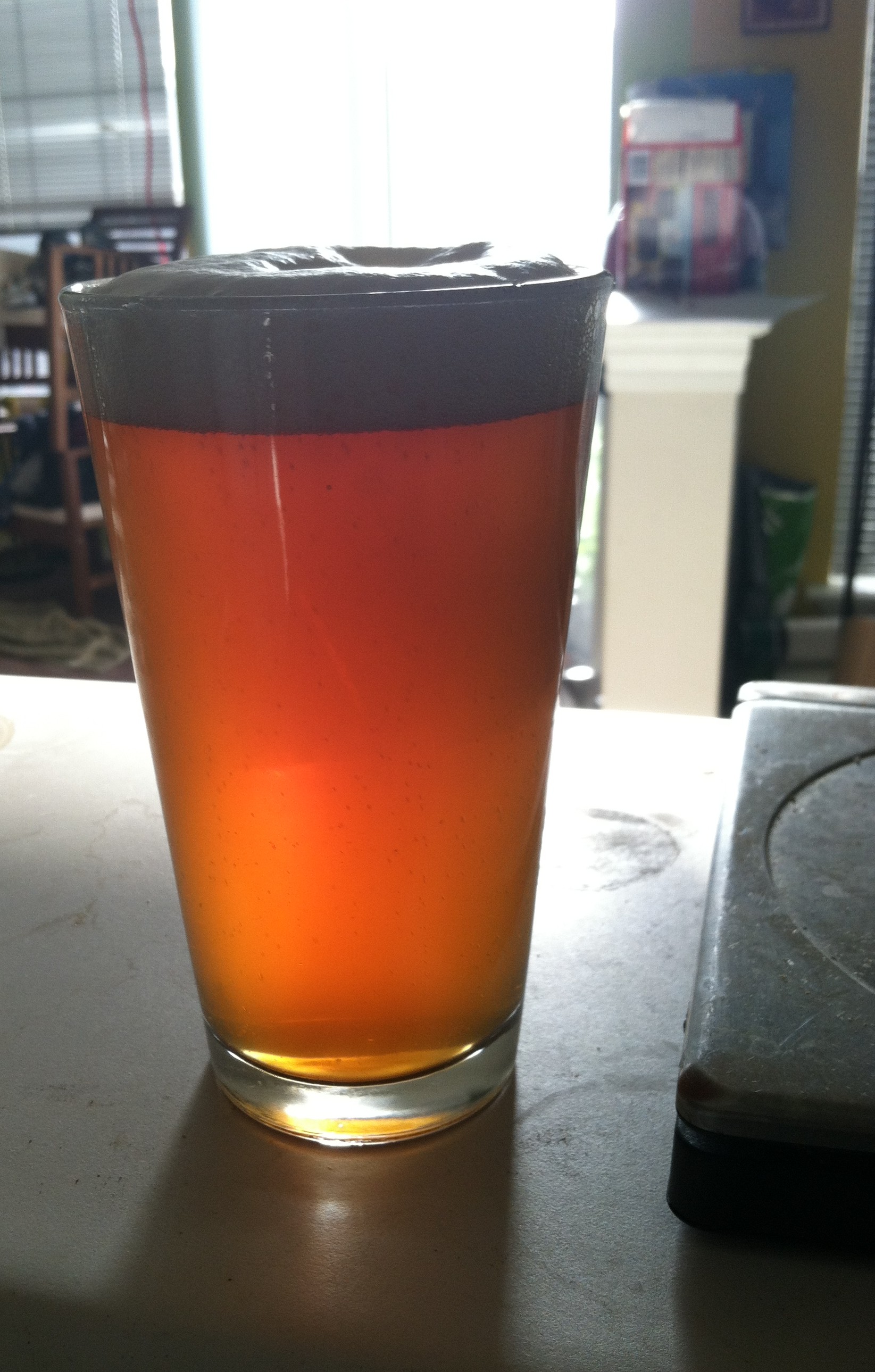 Pouring into a standard pint glass, this APA has a hazy, bright orange appearance was dense, white head. The aroma is bright with loads of citrus, along with the sort of aroma you always get with CTZ hops (dank, pine-y, complex?). Also, with a bit of age (~ 1 month), nice hints of malt complement the strong hop aroma. Taking a sip, strong bitterness is noticeable upfront, along with the citrus-y, dank hop flavor. In the finish, the bitterness lingers while the malt background keep it from being harsh, making you want another slip.