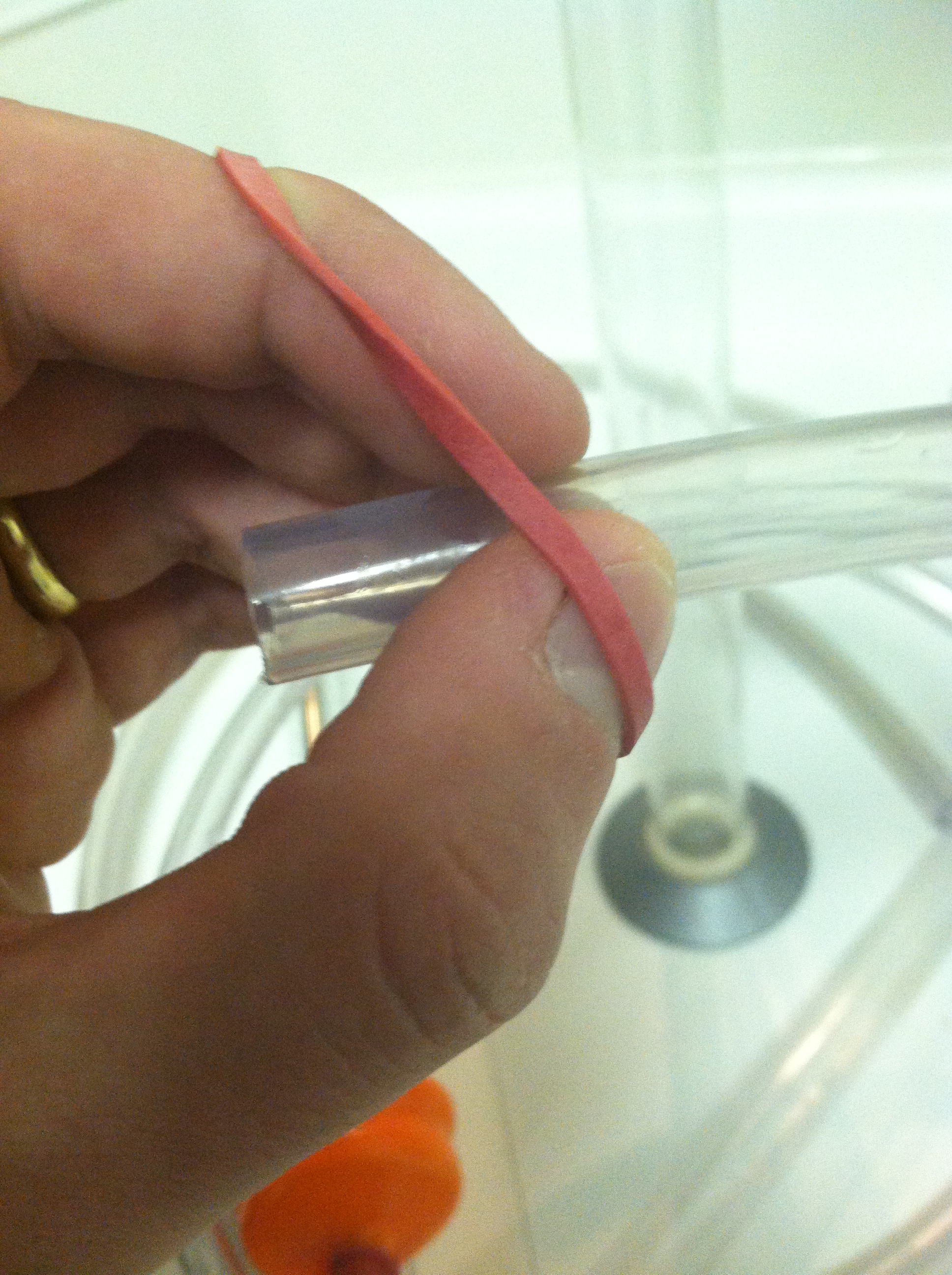 Starting the wind Published at 1936 × 2592 in Apartment Brewing Tech: Siphon Tube Rubberband Hose Clamps « Previous Next » Starting wraping the rubberband around the tubing.