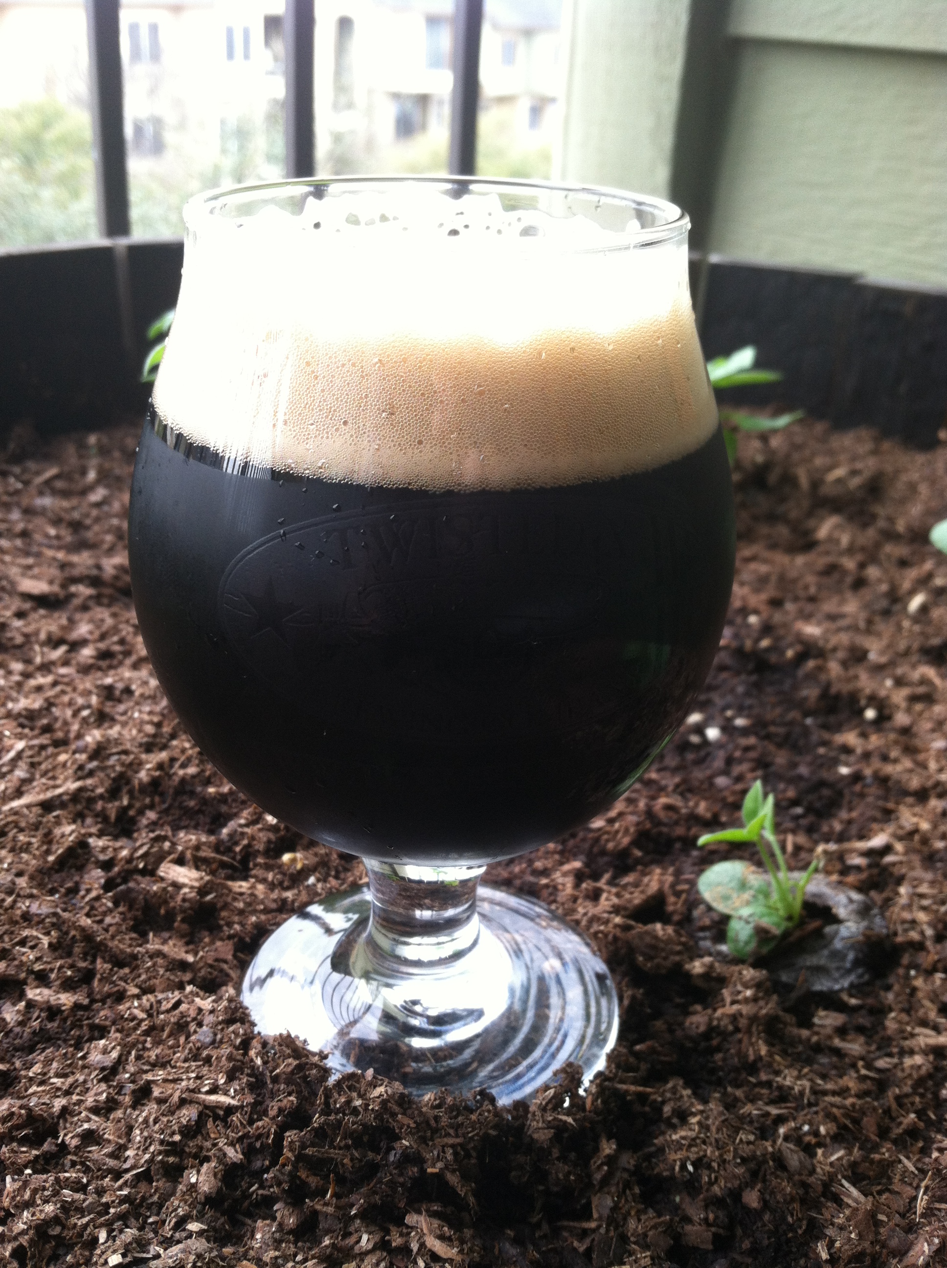Session Oatmeal Stout Published at 1936 × 2592 in Session Oatmeal Stout: Tasting Notes « Previous Snifter of the Session Oatmeal Stout next to sunflower seedlings.